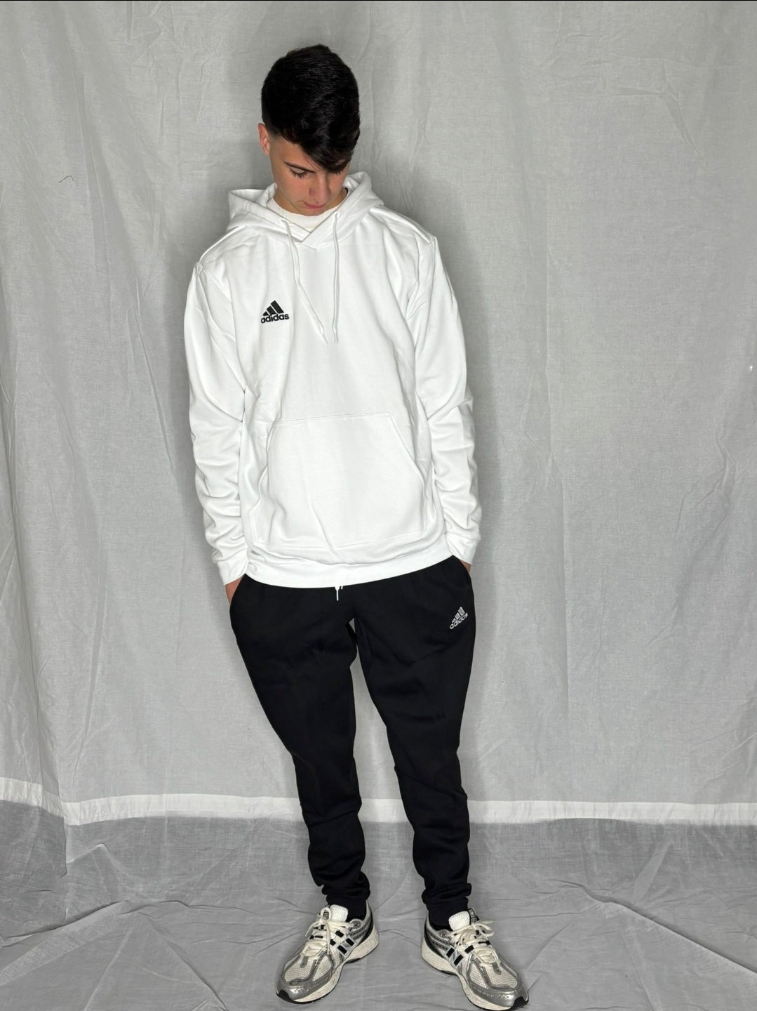 La felpa con cappuccio è dotata di pratica tasca frontale a marsupio e coulisse regolabile, mentre i pantaloni presentano vita elasticizzata con laccetto e tasche laterali funzionali. Il logo Adidas ricamato su felpa e pantalone aggiunge un tocco iconico e riconoscibile.